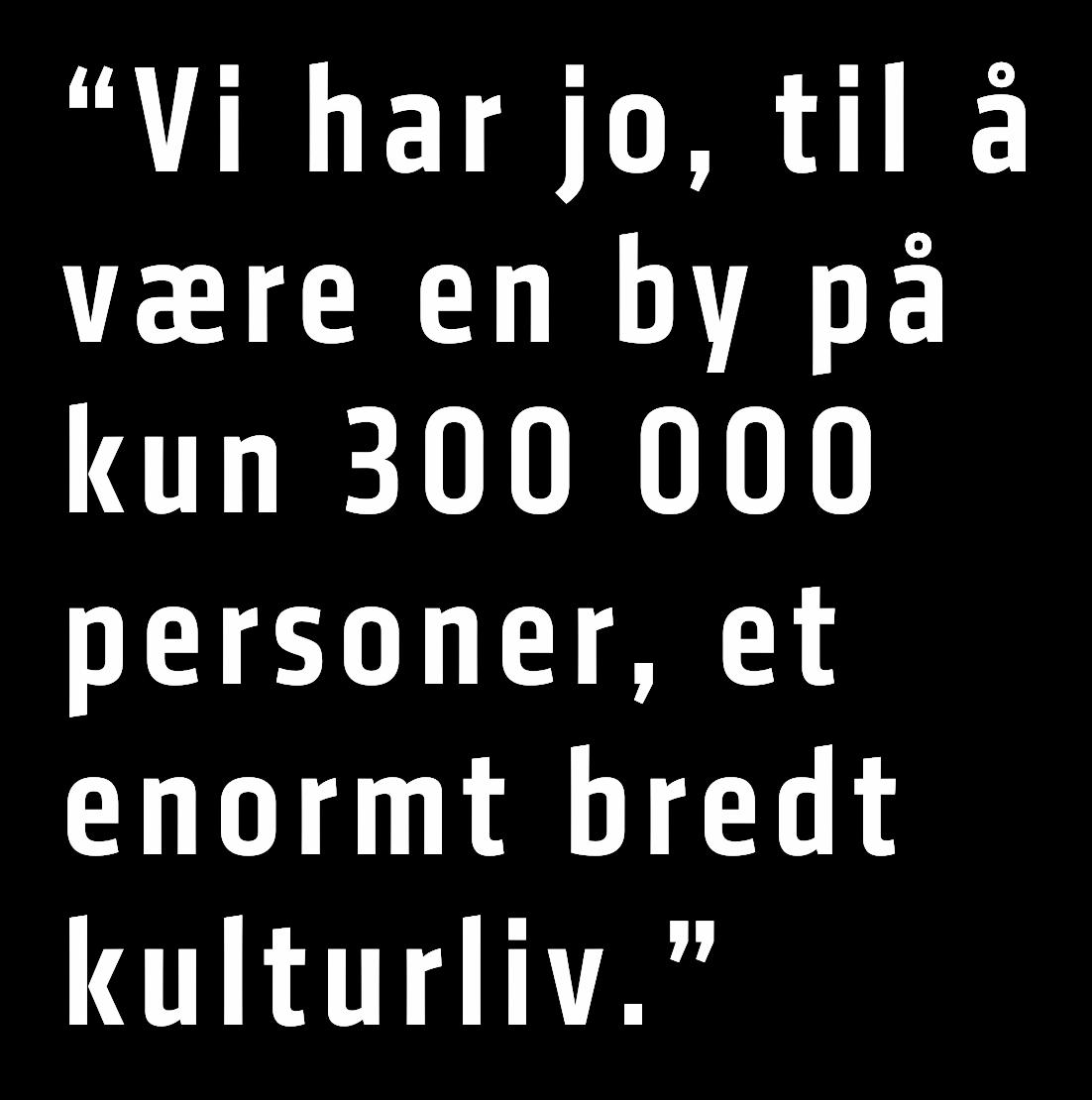 Vi har jo, til å være en by på kun 300 0000 personer, et enormt bredt kulturliv Byen har alle sjangre innen kultur, både bredden og toppnivået. Bergen har også robuste fagmiljøer, for eksempel i samtidskunst og samtidsdans. Vi er i verdenstoppen med Harmonien, Bergen Nasjonale Opera og kunstutstillingen Bergen Assembly