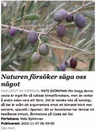 Man uppfattas som en glädjedö dare när man betonar det faktum att snarare än att glädjas åt som marväder på hösten borde vi vara allvarligt bekymrade. Sedan många år har forskare varnat oss för klimat förändringarna, som inte länge är ett framtidshot utan i högsta grad verklig het. Frågan är hur vi bemö ter detta faktum. Njuter av att kunna fira första advent i kortbyxor eller gör allt som står i vår makt för att vända trenden? Förhoppningsvis väljer en majoritet det senare alterna tivet och samtidigt måste vi hålla tummarna för att det inte är för sent.