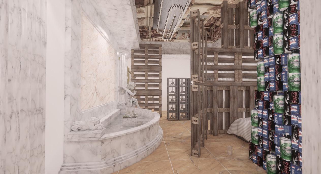 These food machines are stationed throughout the gallery, responding to the various courses of a degustation constructed through architectural means. Scenes from films such as Wes Anderson’s ‘Grand Budapest Hotel’, an adaptation of George Orwell’s ‘1984’, and Studio Ghibli’s ‘Spirited Away’ come to life through the machines.
