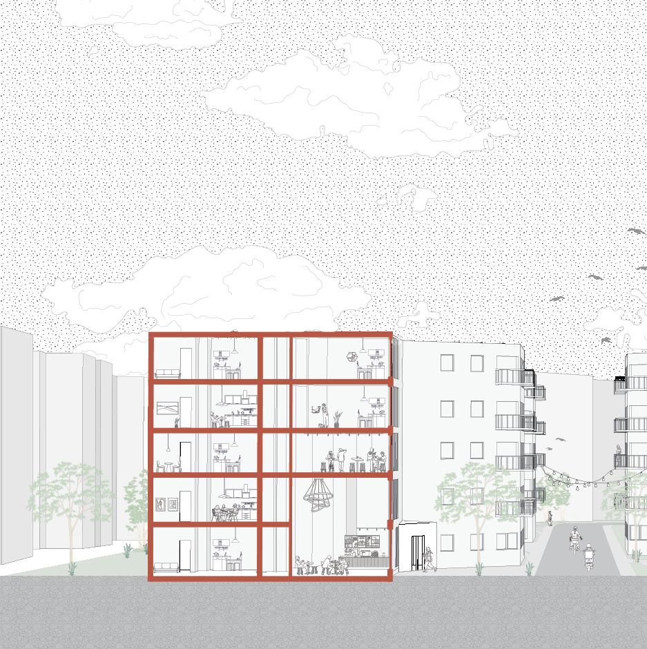 To create a more private feel within each building, they are set up to face one another, creating private courtyards and spaces. The shape emphasizes that similar to the alphabet city verncular of the site. HALF I