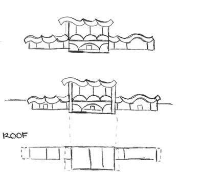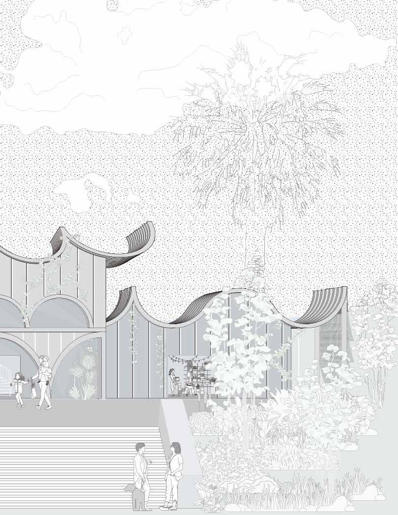 The buildings aim to create a dynamic stepped fashion with terraced spaces for communal function. Continuing the essence and style of surrounding strucures, the L-shape persists with clean, unjulating forms.