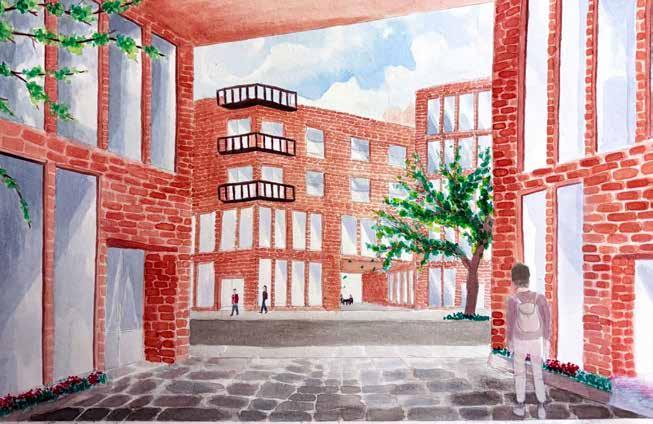 Building ideas of interconnectivity in structural techniques, the double-loaded cooridoor and hexagonal shape emphasises this building’s communuallyfocused spaces and corridor. The communal spaces would serve as student common rooms, workspaces, studios, etc.