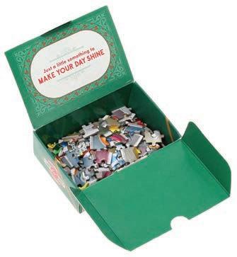 150-Piece Mini Puzzle By Lea Redmond This 150-piece mini puzzle features a variety of colorful ornaments and is tucked inside a box that looks like a wrapped holiday present. Perfect for puzzlers of all skill levels!