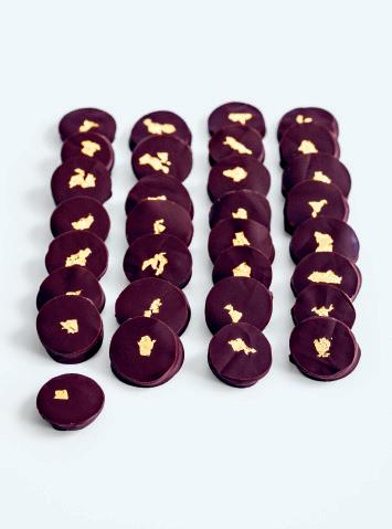3Strain the rest of the mixture into the chocolate and finish the emulsion by stirring for about 1 minute without incorporating air. Cover with cling film (plastic wrap) and allow to cool at room temperature. 4 Cut a polyethylene sheet into 35 squares measuring 4 x 4 cm (1 ¹/₂ x 1 ¹/₂ in). Place them on another polyethylene sheet. When the ganache reaches 35°C (95°F), put it in a piping bag and pipe out 2 cm (³/₄ in) diameter domes onto the squares. 5 Place a second polyethylene sheet on top then use a flat tray to press lightly, to give the sweets their final shape. Leave to set at a 15° to 17°C (59° to 63°F) for 12 hours. 6 Temper the coating chocolate (page 24). Coat (chablon) the tops and bottoms with a fine layer of chocolate (page 273). 7 Coat each one by dipping into the melted chocolate using a dipping fork (page 32). Scrape the fork over the rim to remove excess chocolate. Decorate with a gold leaf fragment (page 283) and immediately place a square of polyethylene sheet on top. Allow to set at room temperature, ideally between 15° and 17°C (59° to 63°F) for 48 hours.