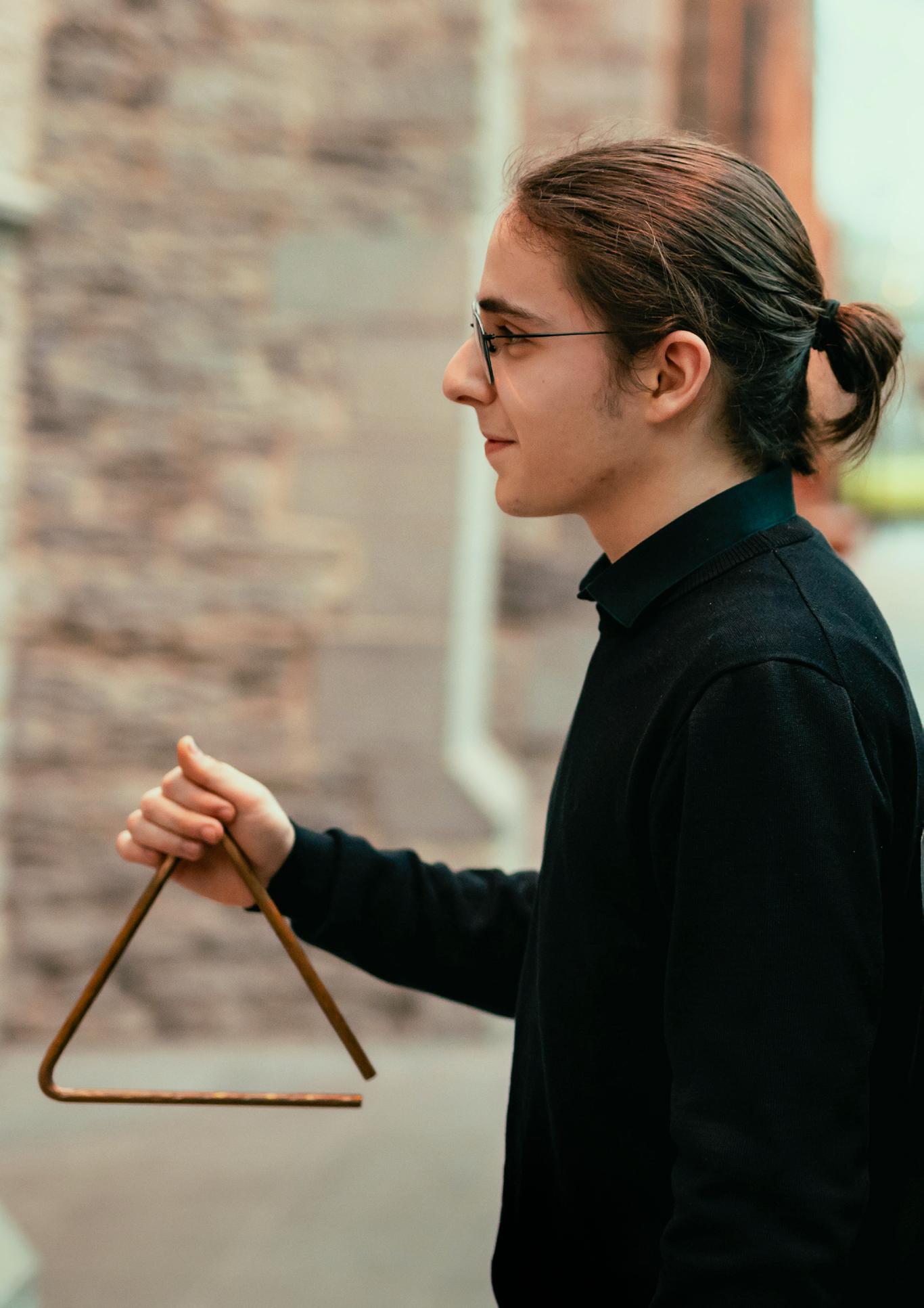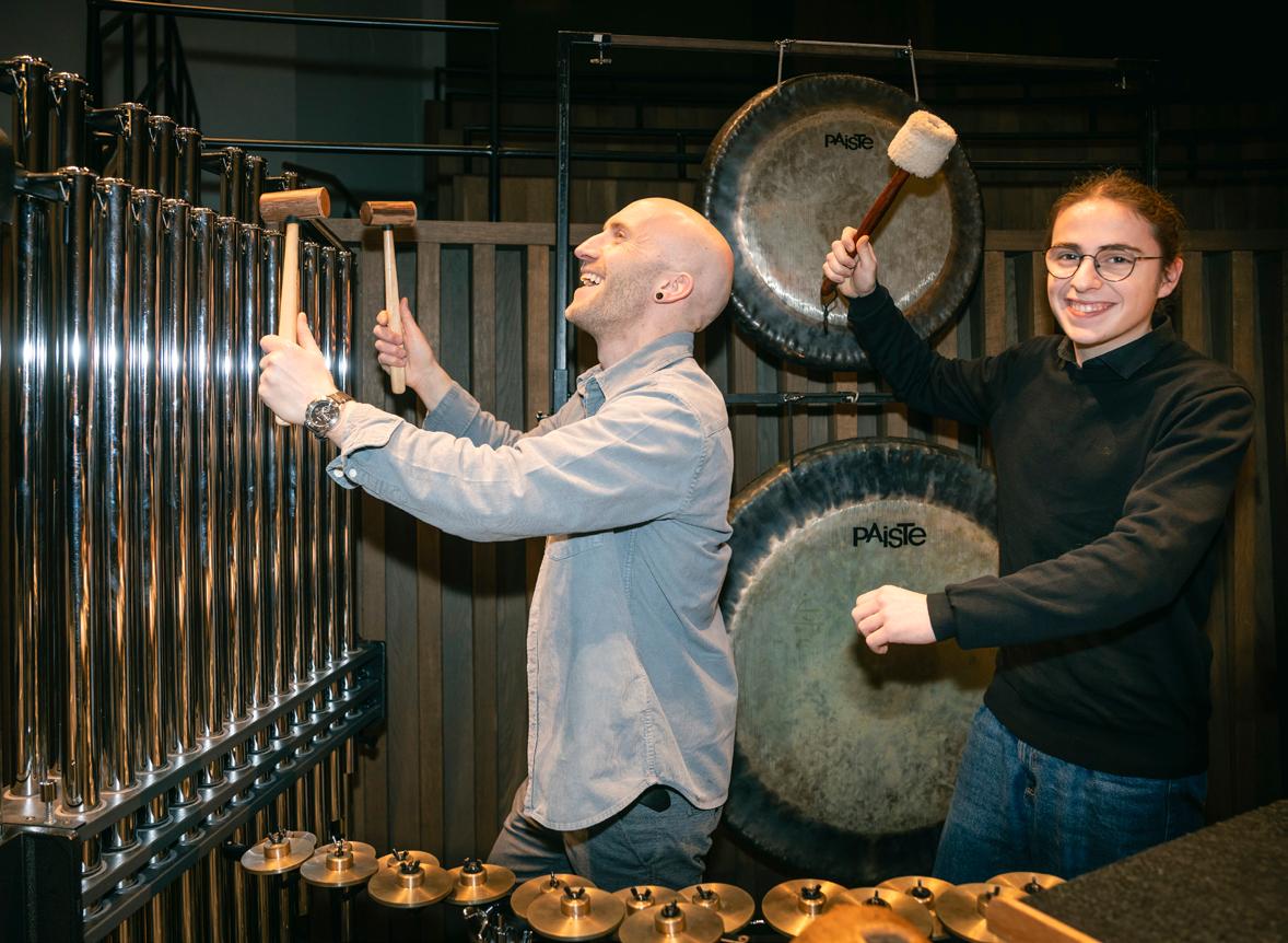 Jonathan maakt van de gelegenheid gebruik om Pallieter een vraag te stellen: “Welk instrument zou jij het liefst bespelen? Dit is het moment om je voorkeur door te geven (lacht)” De jonge muzikant denkt even na. “Ik hou ook wel van de afwisseling, en zie mezelf alles spelen, maar misschien opteer ik toch eerder voor iets niet-melodisch. Ik denk dat ik mezelf dan meer ga kunnen vertrouwen.” Jonathan luistert en knikt: “Dat snap ik helemaal. Sowieso is elke slagwerker bijna een solist: je klinkt in je eentje over heel het orkest. Het zou minder snel opvallen mocht een enkele viool eens een inzet missen. Bij ons heb je die luxe niet, als jij de enige bent met een triangel of tamboerijn in je handen. (lacht) Dat is de zegen en de vloek van ons instrument.” Pallieter luistert met grote ogen naar wat Jonathan te vertellen heeft. Je ziet dat ze allebei zin hebben om zich in de partituur te verdiepen. Laat die repetities maar beginnen!