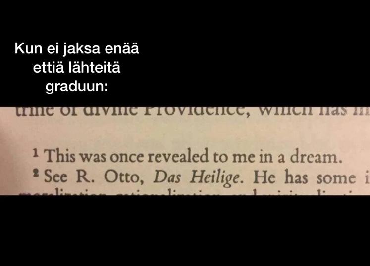 Yliopisto-opintojen aloittaminen on viimeistään ensimmäinen askel kohti työelämää. Ensimmäisen vuoden opiskelijalle tämä ajatus voi tuntua kaukaiselta: mikä työelämä, vastahan tässä päästiin opiskelemaan. Opintojen alkaessa opiskelijaelämä tuntuu päättymättömältä ja jopa pysyvältä elämäntilalta. Pidempään opiskelleet tietävät, että vuodet menevät lopulta nopeasti ja työelämä pääsee jopa yllättämään. Suodaan silti jokaisella aloittelevalle opiskelijalle tuo ihana tunne ja muistetaan me muutkin elää hetkessä ja nauttia opiskelijaelämästä, vaikka työelämä lähestyisikin.