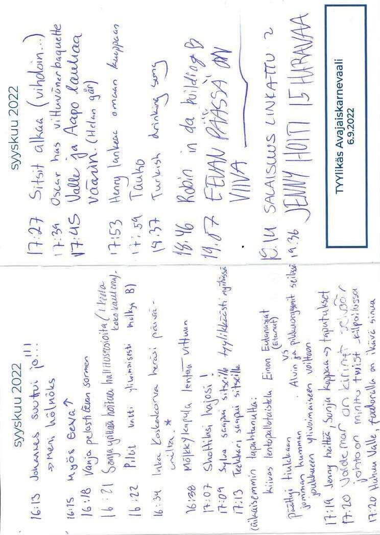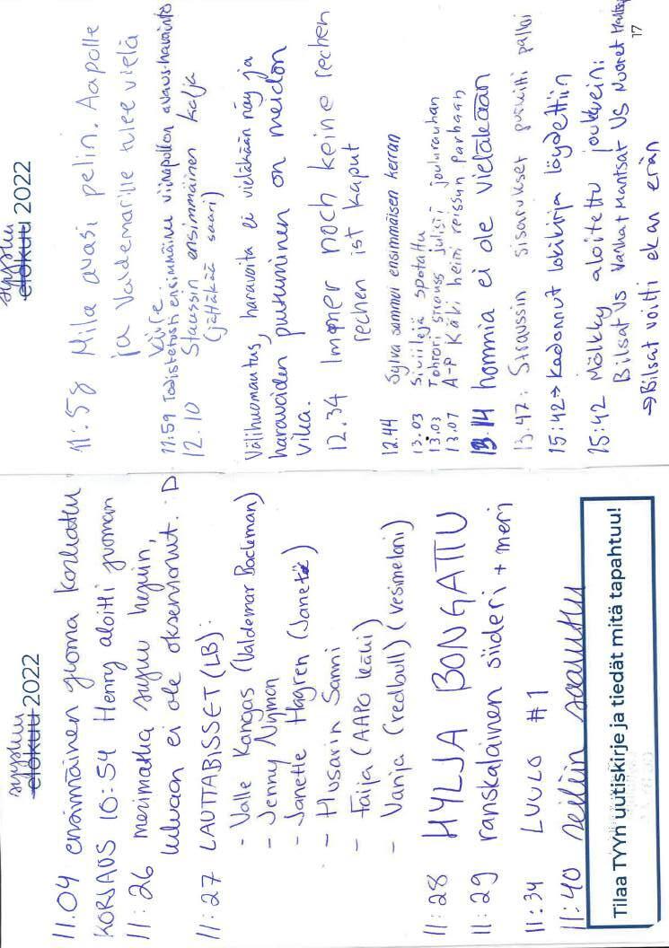 [10.10] Inka: Hei tuli mieleen tällainen: jos pidetään syksyn numeron suunnittelupalaveri vaikkapa tulevalla viikolla nii pidetäänkö se sillai myös ”uusien iltana” eli varataan joku tila ja laitetaan