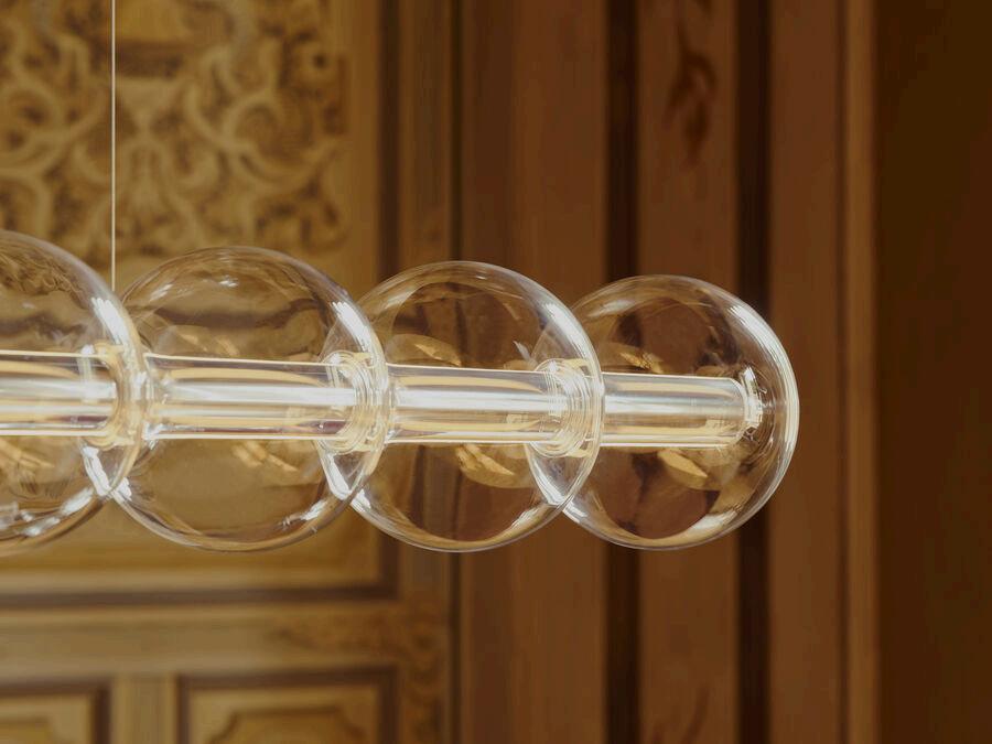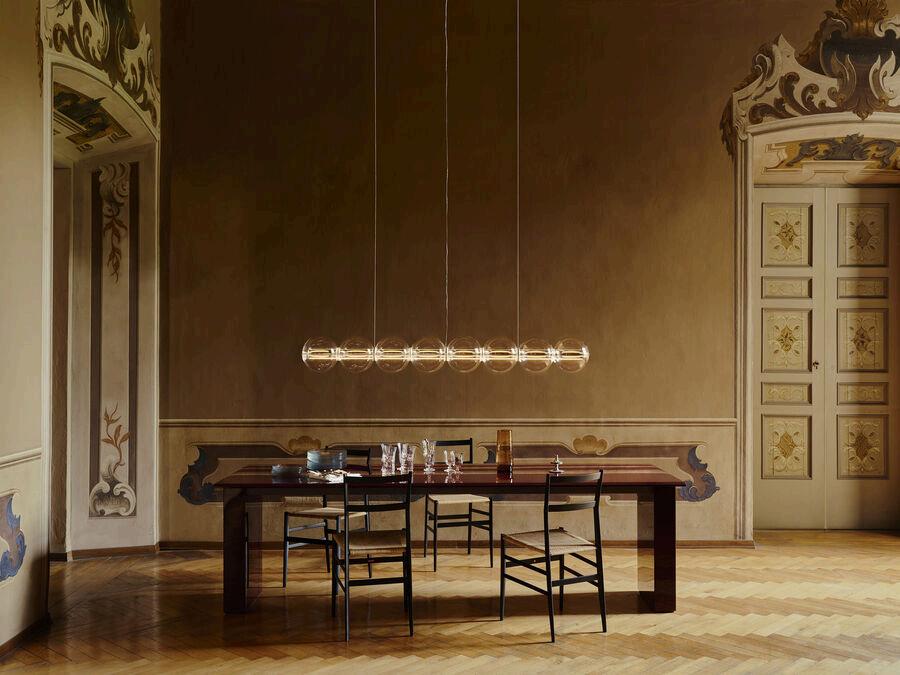Modular suspension lamp emitting diffused light. Horizontal body in polished extruded aluminium with two LED strips for upward and downward emission. Integrated touch dimmer enables independent control of light outputs Body encased in a sequence of hand-blown transparent glass spheres separated by traditional spacers. Can be installed in multiple parallel rows.