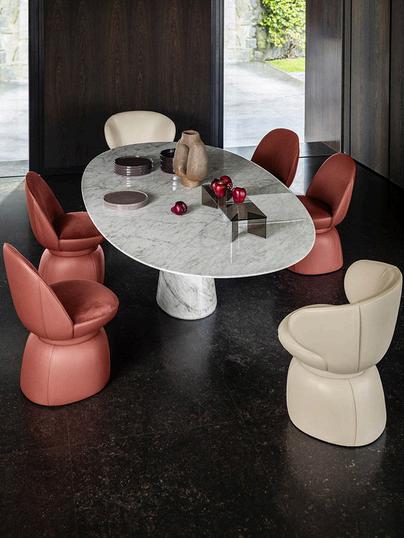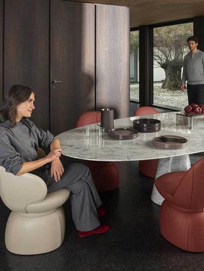 An elliptical table with an essential design, made up of only two elements, which lets the beauty of the shapes and materials speak for itself: the precious marble top with a slender elliptical shape that serves as a counterpoint to the massive column base Available in various finishes, the particular veins of the marble top add uniqueness to each model, enhancing its pure and essential line. The Mesa collection was created by two design household names, Lella and Massimo Vignelli. Based on some unique drawings by Lella and Massimo Vignelli, Poltrona Frau embarked on a painstaking philological task, creating some unpublished versions of the original table, called Mesa Due.