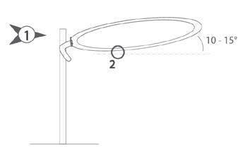 For Eclipsum (UX/PX), we advise to position the umbrella in the direction of the wind (1), put the circle under a slight angle (2) and put it on a flat surface.