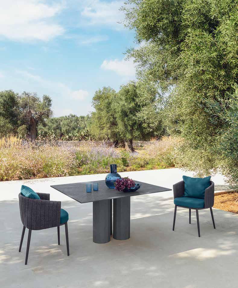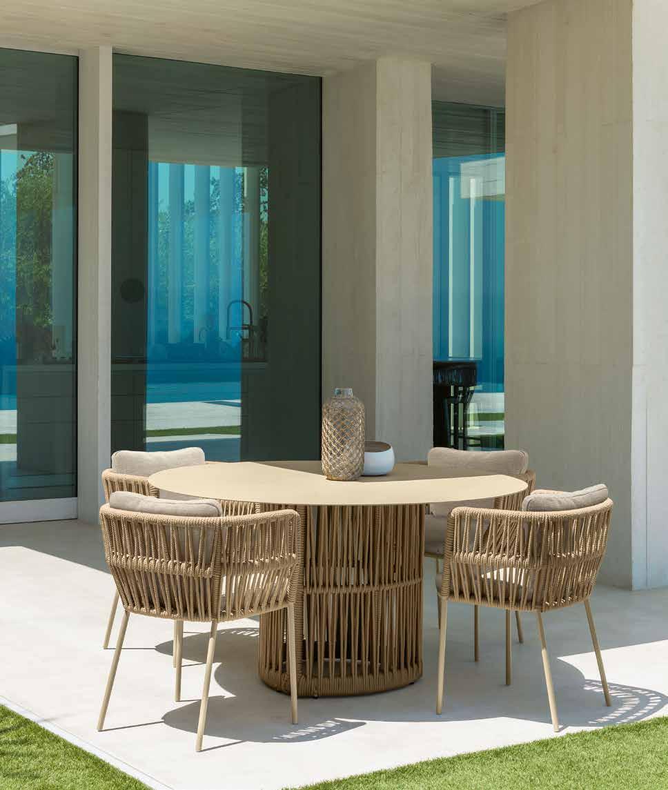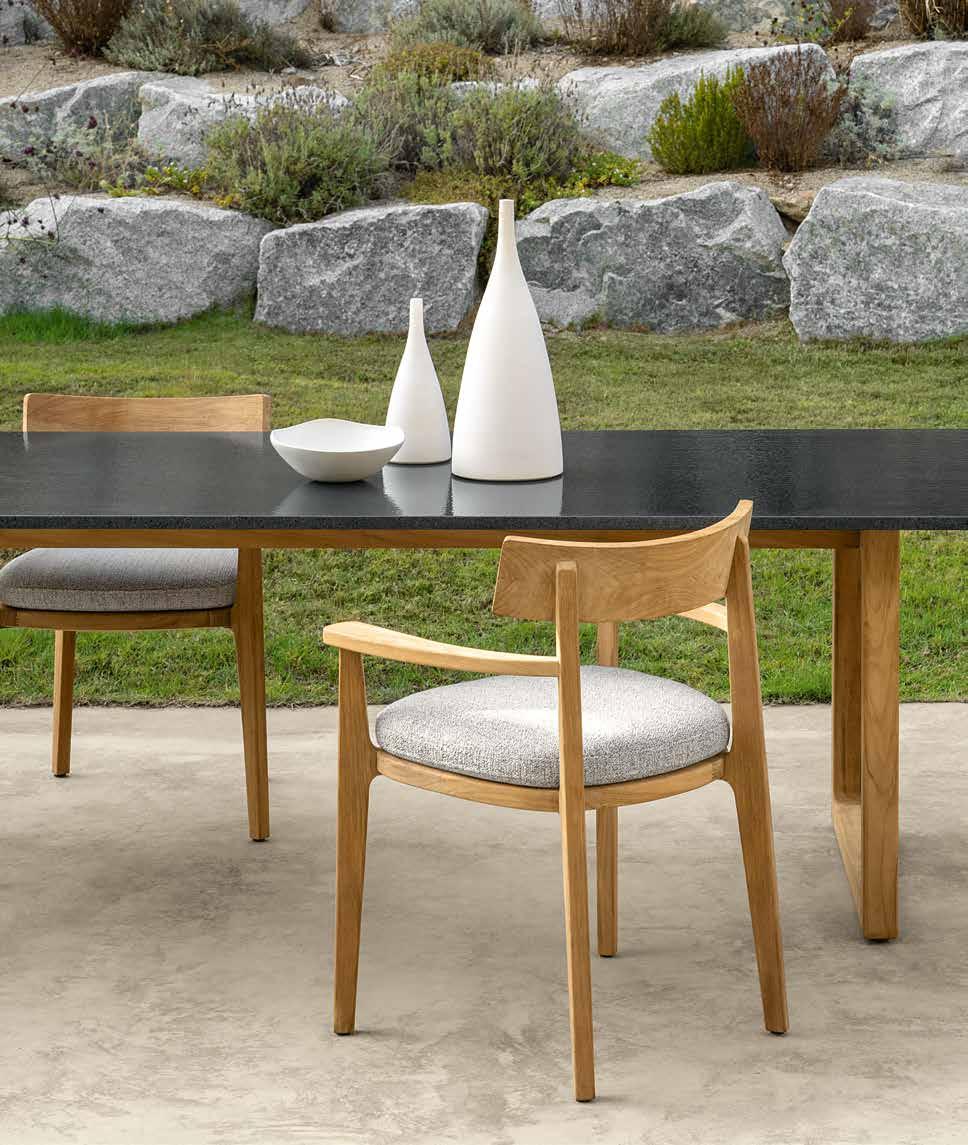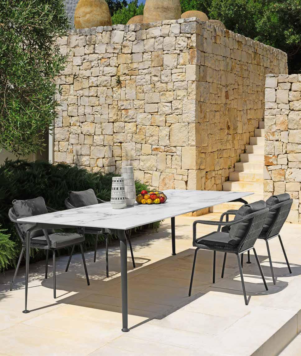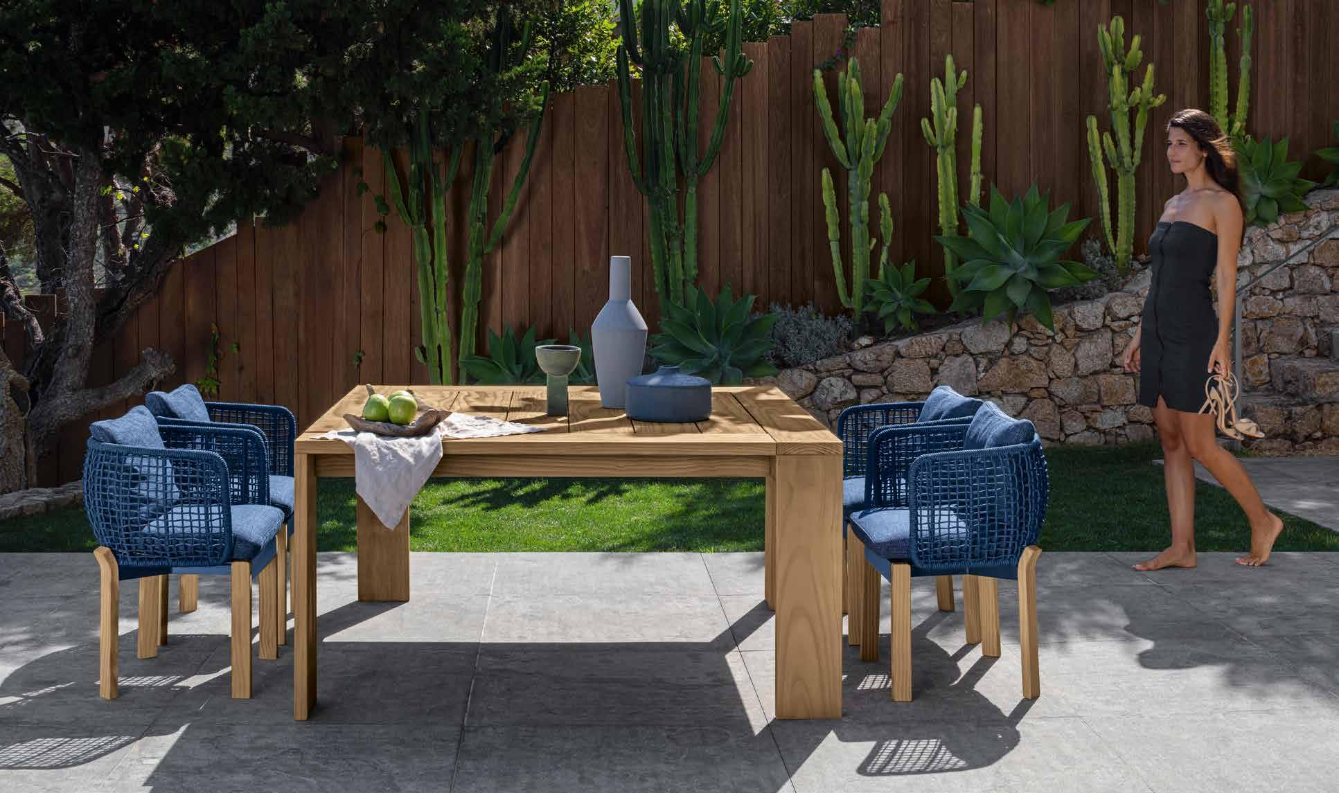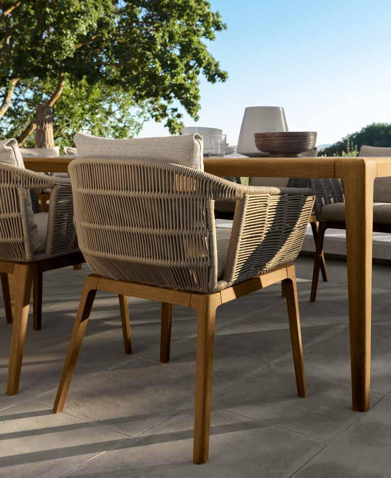 Venicecollection dining table 280x110 accoya wood frame in natural teak colour table top in lava stone prussian blue colour dining armchair teak wood frame in natural teak colour padded rope in nut colour cushions in cordonetto beige colour