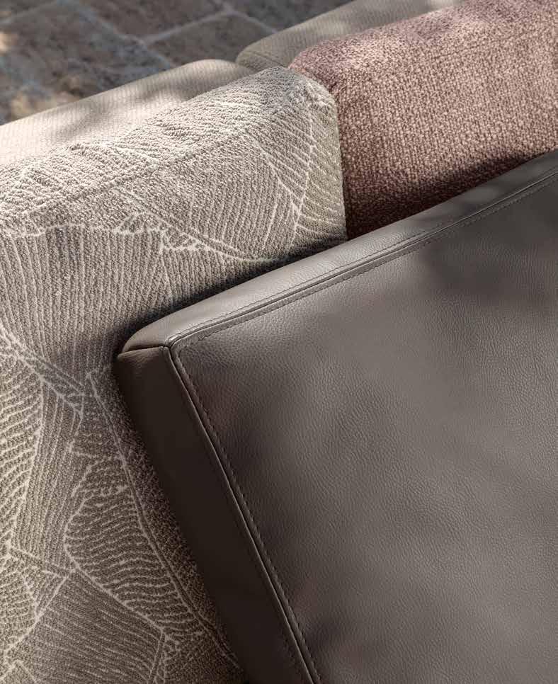 sofa graphite frame colour cushions in canapa colour leather in mud colour deco in plain taupe, plain bordeaux, stripe chamois, rose & asphalt colour table top in lava stone vulcan grey colour