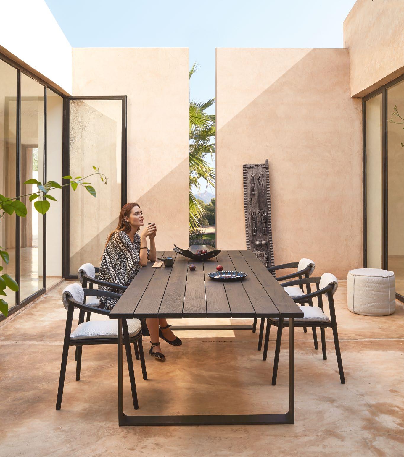 Sit back and relax in the comfort of your outdoor furniture, which combines the natural strength of rope, teak and ceramics with warm, earthy tones that blend gently together. Trim your lush chairs, loungers and sofas with royal cushions that fuse solid fabrics with subtle structures and muted colours: terracotta, pale red, grey, beiges and brown.