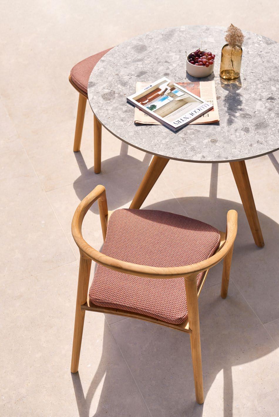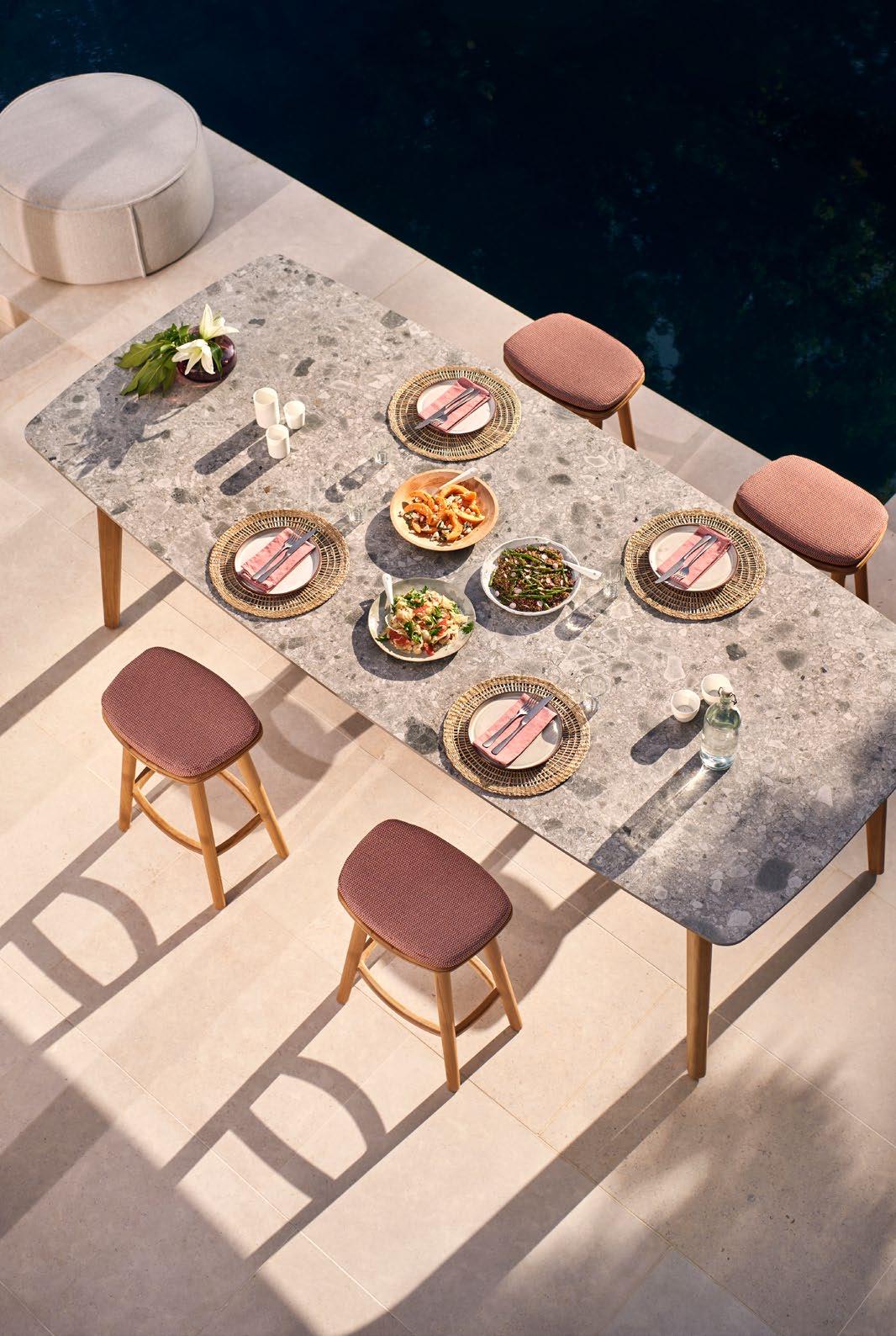 Teak coffee, dining and bar tables are luxuriously appointed: opt for a deep-brown emperador marble with golden tones for majestic wining and dining or discover the history of a soft brown-grey Fossil ceramic. Mix and match with warm, red-toned accessories to complete your space.