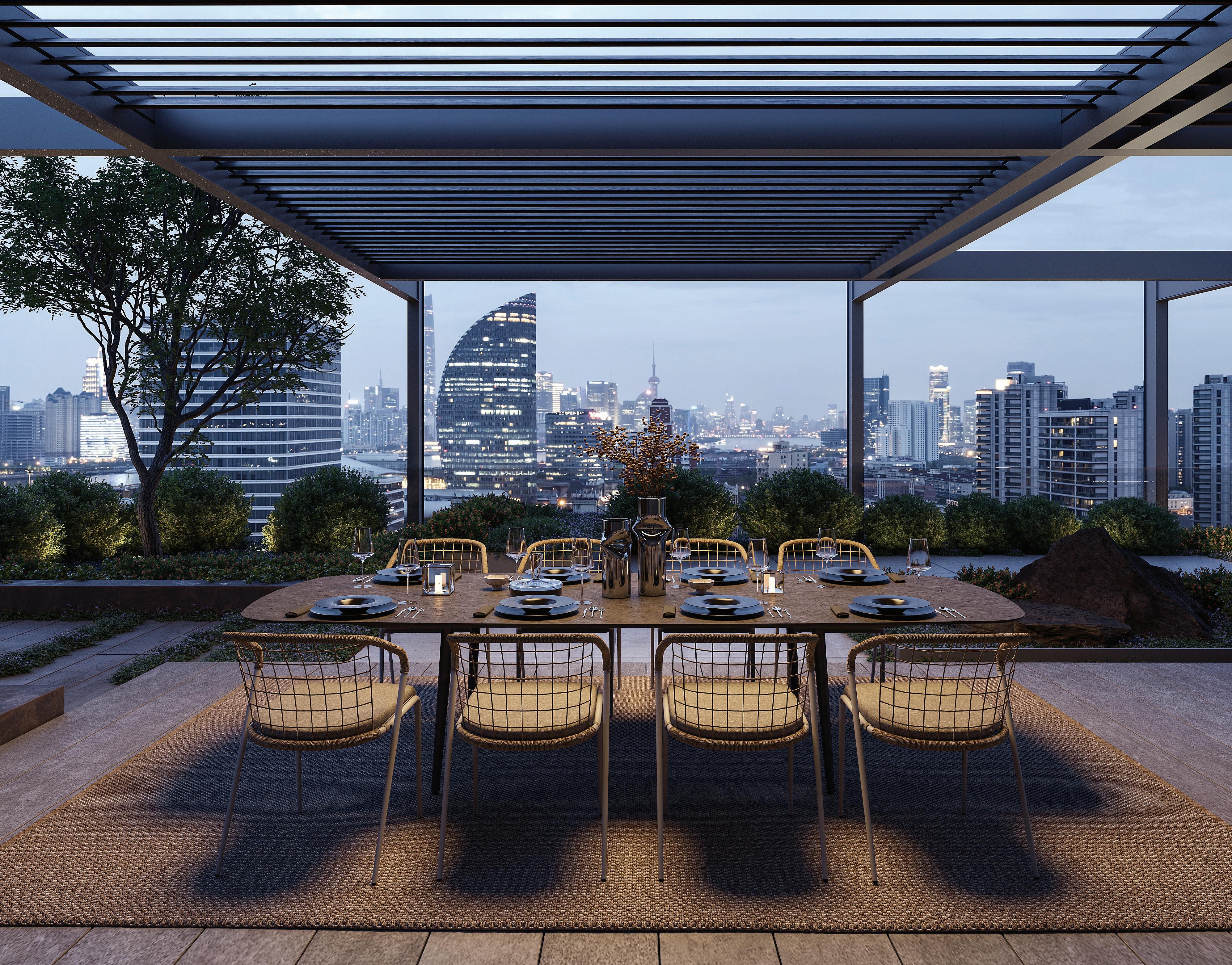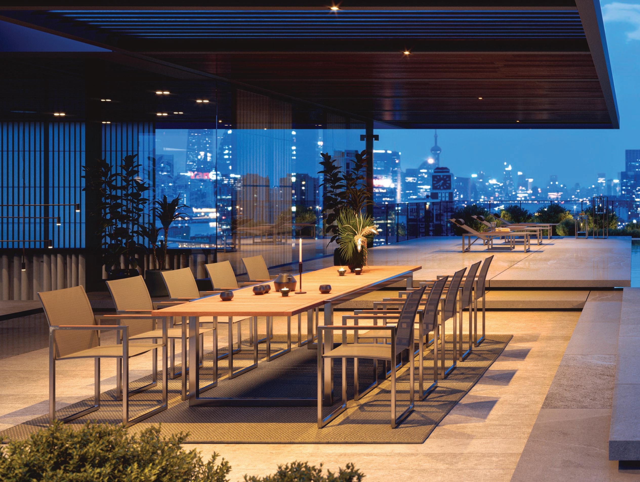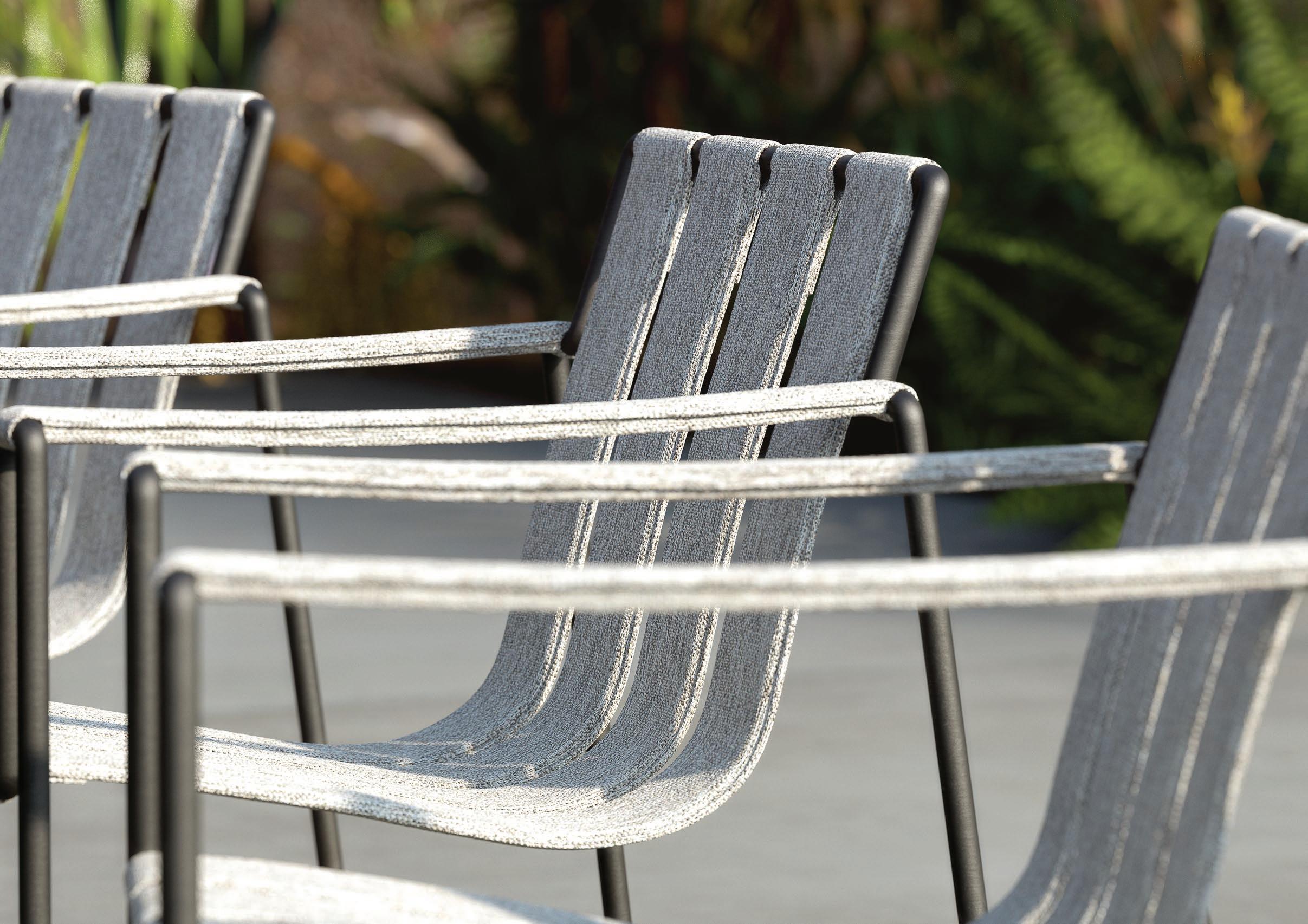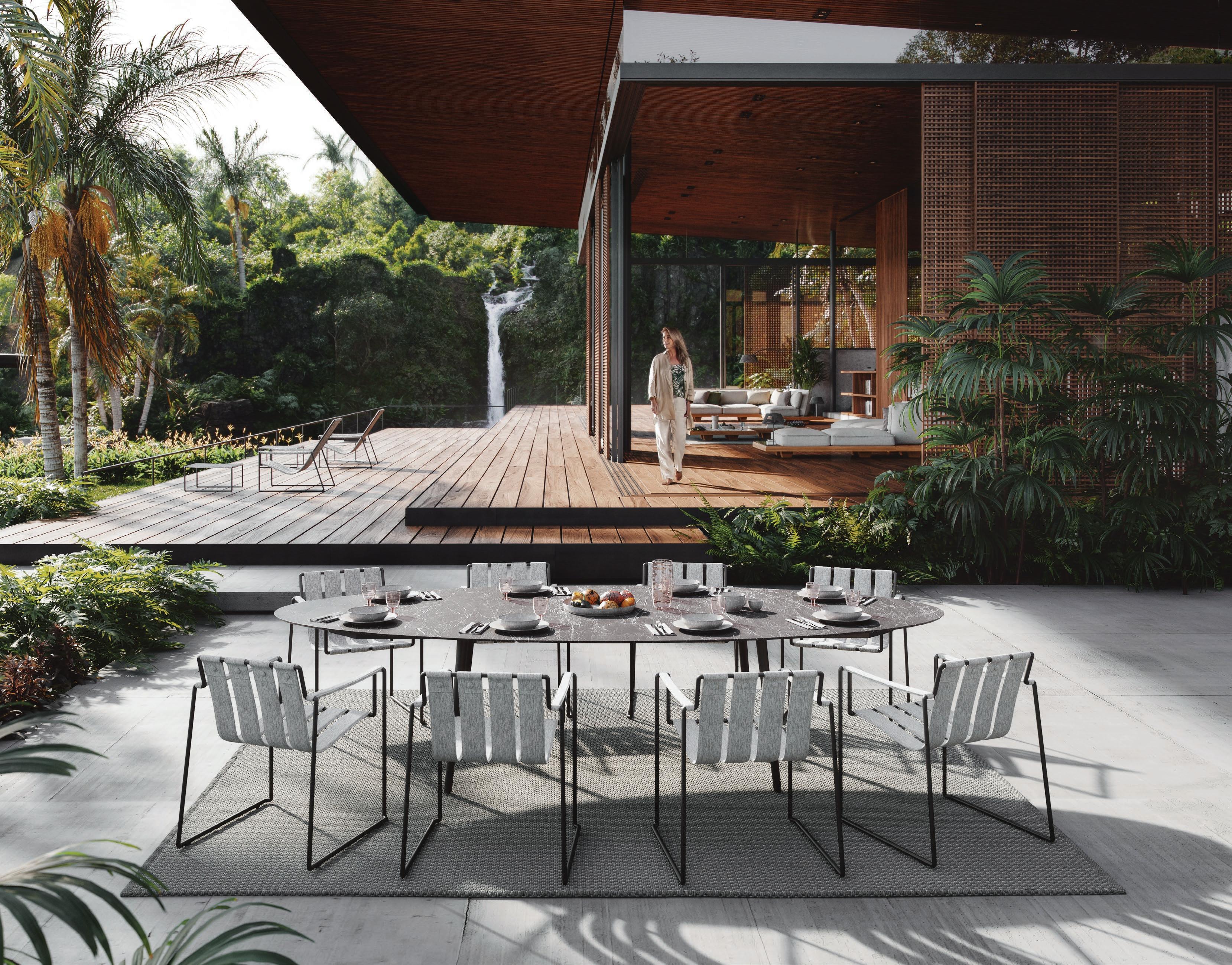 27 STRAPPY 55 DINING CHAIR (P, 317) - STYLETTO 3214 DINING TABLE (P, 331) - RUG (P, 385) - MOZAIX LOUNGE (P. 267) - STRAPPY 195 LOUNGER (P. 316)