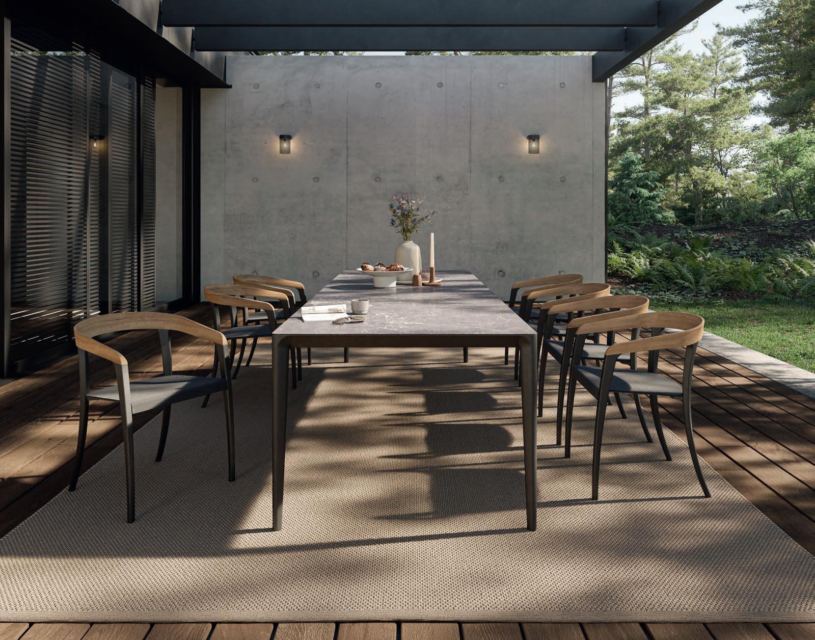 95 STYLETTO 300 LOW DINING TABLE - OSTREA 77 LOW CHAIRS - RUG 2535 - PALMA 300 PARASOL