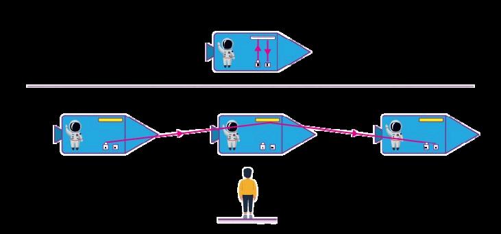 특별상대성이론의경이로운아름다움을이해하기위해, 일정한속도로비행하는로켓을상상해 보세요 로켓의바닥에는빛을방출하는장치가있고, 로켓의꼭대기에는그빛을받는장치가있습 니다. 바닥과꼭대기사이의거리는 30km입니다. 이제빛이발사됩니다. 로켓안에있는사람은빛 이꼭대기에도달하는데약 1초가걸린다고생각합니다 왜냐하면빛의속도는약 30km/s로일정 하기때문입니다 그러나로켓밖에있는관찰자는빛이꼭대기에도달하는데더오랜시간이걸린 다고인식할것입니다. 왜냐하면로켓이이동하는동안빛이여전히진행중이기때문입니다. 따라 서빛은더긴거리를이동하며시간이확장되는데, 이를 '시간팽창'이라고부릅니다