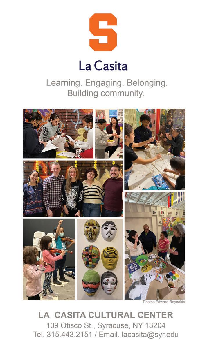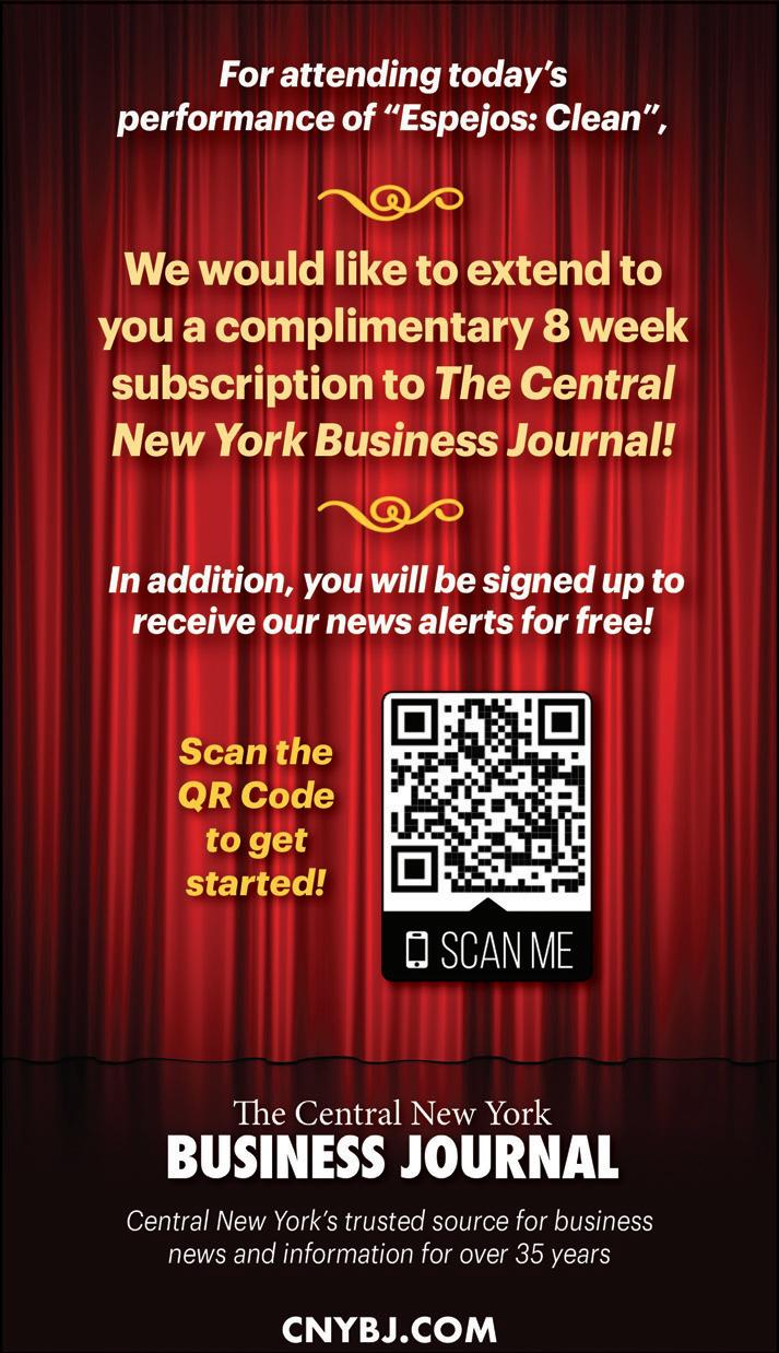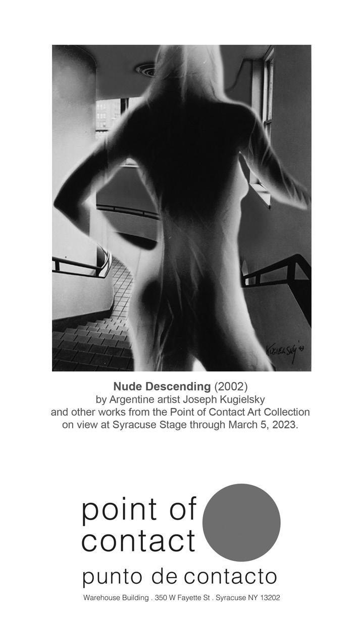 We’re grateful to our season sponsors, production sponsors, and media sponsors (check them out on pages 14 and 15!) for helping fuel this work, and to our community partners at La Casita Cultural Center for helping bring new conversations to life. In keeping with La Casita’s mission to bridge the Hispanic communities of Syracuse University and those of Central New York, we’re delighted to collaborate with our neighbors in the Near Westside. Special thanks to the Syracuse University Humanities Center for their ongoing support, and we hope you’ll join us for events at Stage and at La Casita on Sunday, February 19.