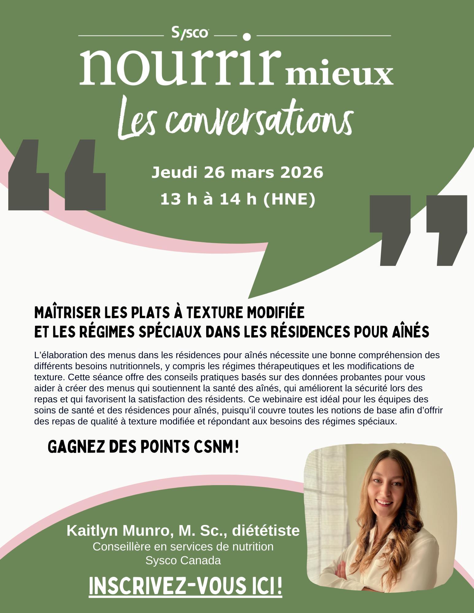 En conclusion : Danslecadredescélébrations duMoisdelanutrition2026,rappelons-nousque l’alimentationn’estpasseulementunequestion denourriture.Ellepermetdecréerdesmoments significatifsaveclesgensquenousservons. Lorsquenousrespectonslespréférences,que noussoutenonslebien-êtreetquenoustenons comptedesdifférentescultures,lesrepasaident lesrésidentsàtisserdesliensetàs’épanouir.