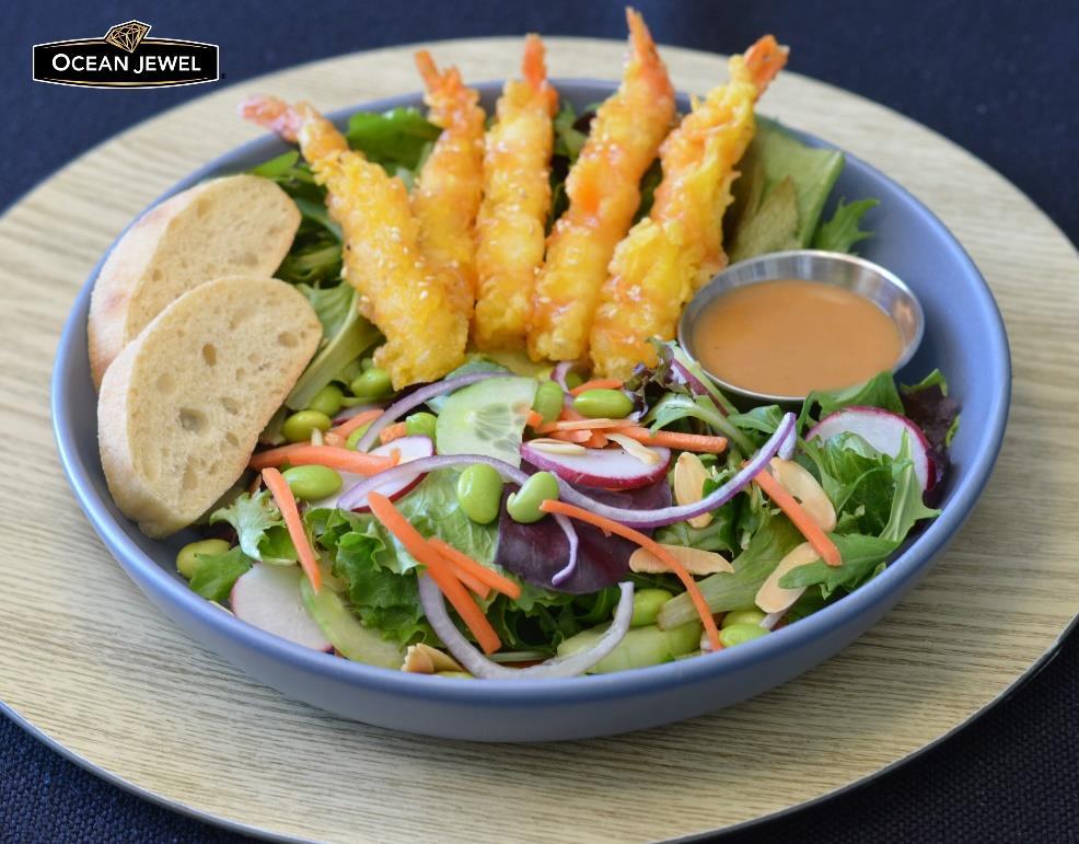 • Saladevertedecrevettestempura sucréesavecvinaigretteasiatiqueau sésame