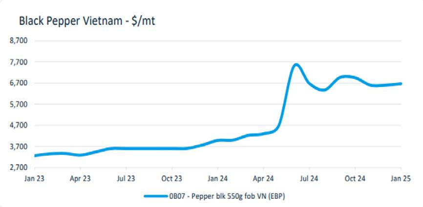 Cyclone activity and weather volatility caused significant price spikes in black pepper earlier this year. While the market has stabilised in recent months, prices are expected to remain elevated through 2025 due to anticipated increases in demand.