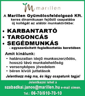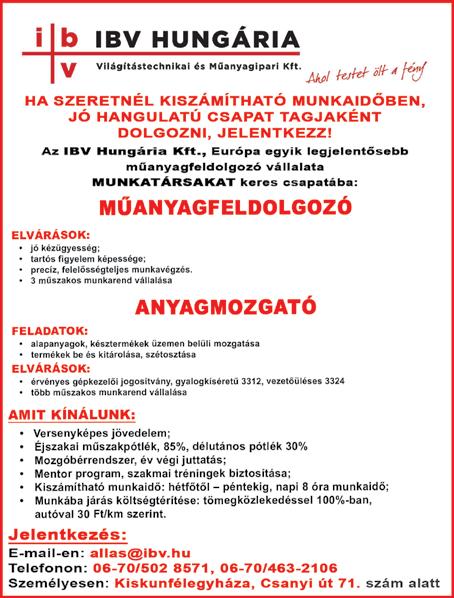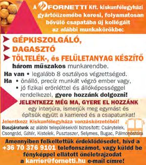 A Szivárvány Személyes Gondoskodást Nyújtó Intézmény (6100 Kiskunfélegyháza, Nádasdy u. 12.) pályázatot hirdet SZAKKÉPZETT SZOCIÁLIS GONDOZÓ ÉS ÁPOLÓ munkakör betöltésére. Érdeklődni Dobosné Harmath Mónika vezető ápolónál lehet a 06-30/815-54-03-as telefonszámon. Részletes pályázati kiírás a www.kiskunfelegyhaza.hu oldalon olvasható. KERTÉSZETBE férfi munkaerőt keresek. Munkába járás, napi fizetés megoldott. Tel.: 06-70/260-7311 (Sinkó) CO2 hegesztőket, ipari festőket, fén�ezőket, porszórókat, festő előkészítőket, CNC gépkezelőket (lemezdaraboló, élhajlító gépek kezelésére), és repasszosokat, csiszolókat, fémipari összeszerelőket, keresünk (pál�akezdőket is). Magas bejelentett órabér, szállás és utazás biztosított. 06-70/908-7935, 06-70/366-5722, e-mail: hegeszto2016@gmail.com (For Job Kft.)