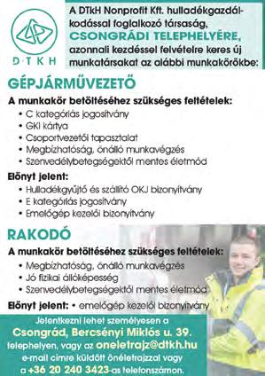 A Félegyházi Városfenntartó Nonprofit Kft. felvételt hirdet az alábbi munkakörökre. Temetkezési betanított munkás. Előny: „B” kategóriás jogosítvány Piactakarító 6 órás részmunkaidőben. Munkavégzés helye Piac és vásártér területe. Jelentkezni Kiskunfélegyháza, Kossuth utca 10. E-mail: fvnp@fvnp. kiskunfelegyhaza.hu Érdeklődni: 06-70/321-0575