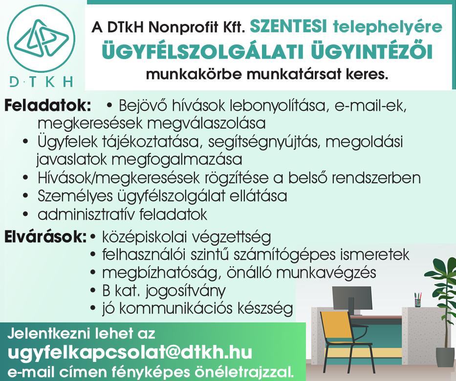 • Szentesi telephellyel rendelkező cég munkatársat keres irodai adminisztrátor munkakörbe. Előny: gyors-és gépírás, számítógépes ismeretek (Word + Excel), idegen nyelv (angol, német) ismerete. Jelentkezni önéletrajzzal az alábbi e-mail címen lehet: szentesgep@ gmail.com