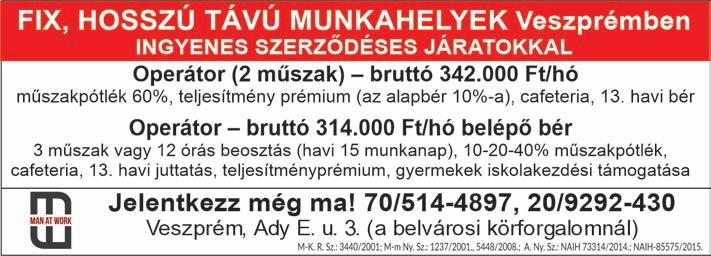 A Beo Kft. szabászt és varrni tudó varrónőt keres nyirádi varrodájába. Érdeklődni: Vigh Annamária varrodavezetőnél lehet hétfőtől-péntekig 8:00 –15:00 között az alábbi telefonszámon: <+36/30/407-5260 Halimbai élelmiszerboltba eladót, árufeltöltőt keresek. < 06/30/946-1485, Székesi-Ker Kft.