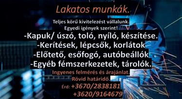 Toló kapuk, úszókapuk, lépcsők, kovácsoltvas jellegű kapuk, kerítések, íves polikarbonát tetők, egyéb lakatosmunkák. < 06/30/972-6335