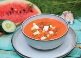1. Előkészítjük az alapanyagokat. A dinnyét kimagozzuk, kockákra vágjuk. A hagymát meghámozzuk, felkockázzuk, a fokhagymát szintén meghámozzuk. A paprikát megmossuk, kicsumázzuk, ezt is nagyobb darabokra vágjuk. Az uborkát meghámozzuk, felkockázzuk. A paradicsomok végét x alakban bevágjuk, forrásban lévő vízbe rakjuk 1-2 percre, majd szűrőkanál segítségével átteszszük jéghideg vízbe, ezután meghámozzuk, félbevágjuk, ha szükséges, kivágjuk a csumákat, és rusztikus darabokra vágjuk. 2. Turmixgépbe halmozzuk az előkészített hozzávalókat, ízesítjük a balzsamecettel és a citromlével. Fűszerezzük a kaporral, sóval, borssal. Ráöntjük az olajat, végül a vizet is. Ha mindent beleraktunk, lefedjük a turmixgépet, és 5-6 percig erős fokozaton homogénre turmixoljuk a hozzávalókat. 3. Az elkészült levest akár le is szűrhetjük, vagy hagyhatjuk ebben az állapotában is. Hűtőbe rakjuk 4-5 órára, majd apró paradicsom- és uborkakockákkal, valamint feta sajttal és kaporral megszórva tálaljuk.