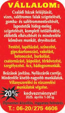 KÖLTÖZTETÉS, fuvarozás. Tel.: 0630/952-50-19 • Bolba. VESZÉLYES fák kivágása ágdarálással, faápolás, tuskómarás. Tel.: 06-30/400-19-55