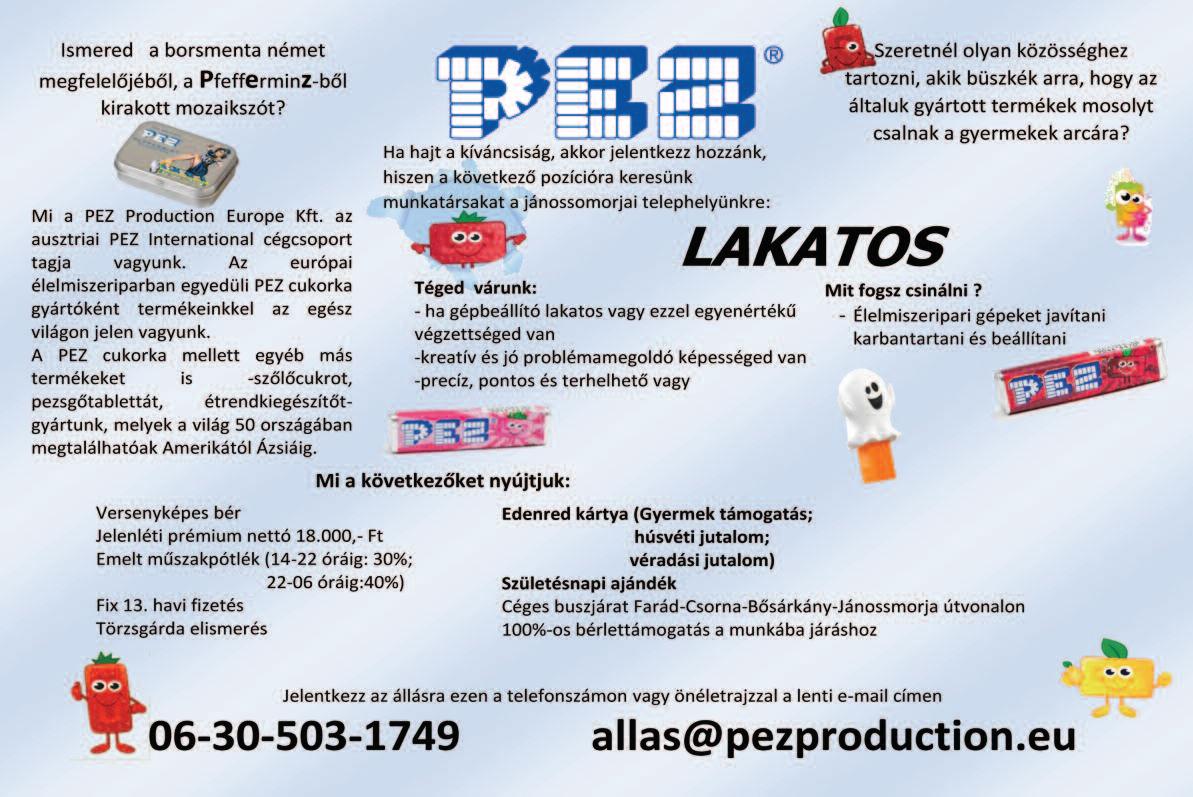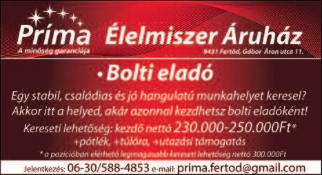 Mobil wc-ket szállító és tisztító autóra keresünk hosszútávra 20-25 év közötti sofőrt .Kapuvár és környékéről Kiemelt bérezési lehetőséggel kategória szükséges.06-20/496-0073 Kiss Imre Könnyű fizikai munkára keresünk nyugdíjas férfit, Kapuvár és környékéről ,akár heti 2-3 napra 0620/496-0073 Kiss Imre Csornán Nemes Pékségbe délelőttös műszakba (4-12 óráig) bolti eladót felveszünk 06-30/9277-834