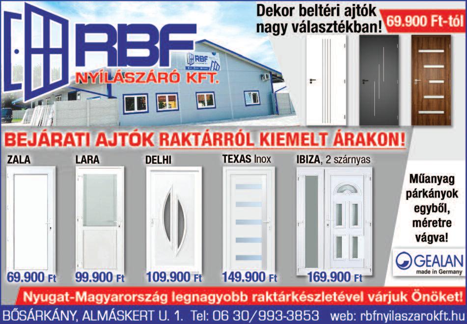 Garázskapu, bukó rendszerű, fehér színben, 1 év garanciával: 240x200as, 240x210-es és 250x200-as méretben 159 900 Ft/db, 260x210es méretben 179 900 Ft/db, 260x225-ös méretben 189.900 Ft/db 06/30/610-3850 www rbfnyilaszarokft hu , Bősárkány, Almáskert u 1 Étkezőgarnitúra eladó tömör fából, közvetlenül a gyártótól Asztal + 6 kárpitos szék 99 900 Ft, színválasztékkal, raktárkészletről elvihető 06-30/639-1574 www szaszabutor com Üveges fa bejárati ajtók hőszigetelt üveggel, záró gumitömítéssel, kilinccsel, kulcsokkal, 98*208-as méret (egyszárnyas kivitel) 119 900 Ft/db, valamint138*208-as (kétszárnyas kivitel) 159 900 Ft/db 06/30/6103850 www rbfnyilaszarokft hu , Bősárkány, Almáskert u 1