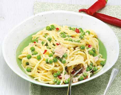 1. A sonkát csíkozzuk fel. A csilit hosszában szeljük félbe, magozzuk ki, és vágjuk finomra. A tésztát főzzük ki forrásban lévő, sós vízben a csomagolásán megadott utasítás szerint. A főzési idő vége előtt 5 perccel adjuk hozzá a megtisztított borsót, és így főzzük készre mindkettőt. Végül szűrjük és csepegtessük le a keveréket.