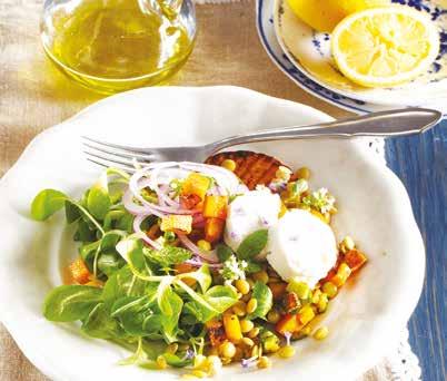 500 g sütőtök, 3 ek olívaolaj, 300 g lencse (konzerv), 150 g madársaláta, 40 g tökmag (hántotl), 120 g puha kecskesajt, 1 fej lila hagyma, levendulavirágok (elhagyható), 1 tk méz, 1 ek citromlé, só, bors.