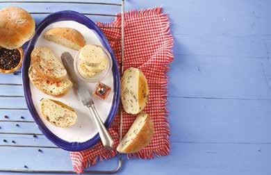 4. A fűszervajhoz robotgéppel habosítsuk fel a szoba hőmérsékletű vajat, majd ízesítsük egy kevés sóval, borssal. Ezzel kínáljuk a bucikat.