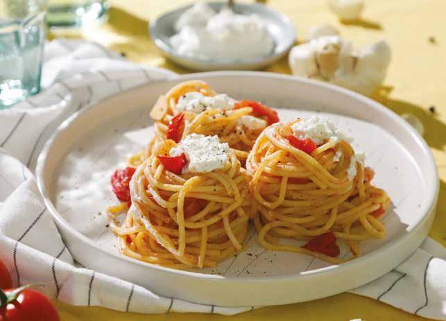 3. A paradicsomos mártáshoz hozzáadjuk a tésztát, majd a tészta főzővizét, és jól összekeverjük. Végül a ricottát a tészta tetején eloszlatjuk.