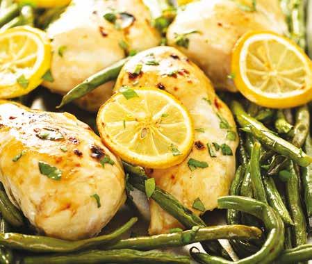 1 tk paprika, só, bors, 4 csirkecomb csont és bőr nélkül, 450 g zöldbab, 3 ek vaj, 1 kis hagyma felkockázva, ½ csésze felvágott petrezselyemzöld, 4 gerezd fokhagyma, ¼ tk csilipor (ízlés szerint), ½ citrom leve és citromkarikák, ½ csésze csirke alaplé.