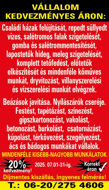 TELJES körű lakásfelújítás, külső-belső teljes átalakítása A-Z-ig. Kőművesmunkák, homlokzat-szigetelés, salétrommentesítés, betonozás, térkövezés, hideg-meleg burkolás, kerítésépítés, külső-belső festés, nyílászárók cseréje, tető-, kéményjavítás, kúpkenés, csatornázás, víz-, villanyszerelés. Farkas Roland. Ingyen felmérés, korrekt ár! Tel.:06-70/626-8447