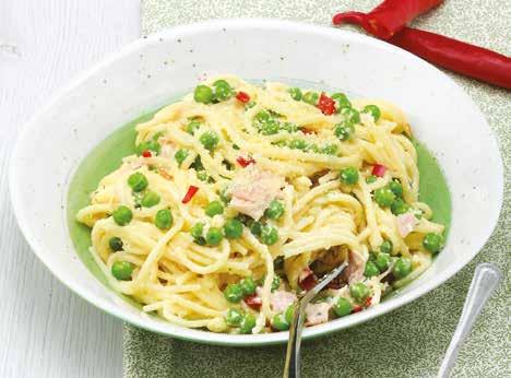 2. Keverjük simára a tejszínt a tojásokkal, a sajt felével, a csilivel és a megmosott, megszárogatott petrezselyem lecsipkedett, finomra vágott leveleivel. Forgassuk össze az így kapott mártást a borsós tésztával, valamint a sonkával. Forrón, a megmaradt parmezánnal megszórva kínáljuk.