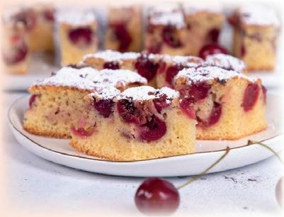 3. A masszát sütőpapírral bélelt, közepes méretű tepsibe simítjuk, a tetejét kirakjuk a cseresznyével, majd 180 fokra előmelegített sütőben kb. 30 perc alatt készre sütjük. Tűpróbával ellenőrizzük, majd a tepsiben hagyjuk kihűlni.