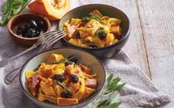 3 Forgassuk össze a kifőtt tésztát, a tökpürét és a zsályás húskockákat. Tálaljuk a lereszelt sajttal, és díszítsük néhány szem olajbogyóval.