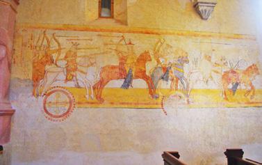 A Szent László-legendát megidéző falfestmény az 1068-as kerlési csatát ábrázolja, amelyben az akkor még herceg László csapataival harcolt a betörő úz, besenyő vagy – más válto -