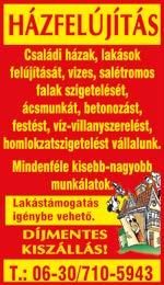 LAKÁSFELÚJÍTÁST TELJESKÖRŰ GARANCIÁVAL vállalunk. Szigetelést, térkövezést, lakatos munkálatokat, salétromtalanítást, festést-tapétázást, régi tetők javítását többéves tapasztalattal. korrekt áron. Érd: 06-70/385-5385.