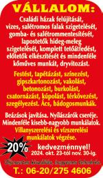 KŐMŰVES MESTER vállal házak építését felújítását, repedt, süllyedt házak vizesedését, beázását, dryvitozást, burkolást, festést, parkettázást, kerítés építését, javítását. Teljeskörű tetők elkészítését, kéményeket és kúpolásokat! Nyugdíjasoknak 20% kedvezmény nov 4- nov.30-ig. Tel: 06-30/885-9621