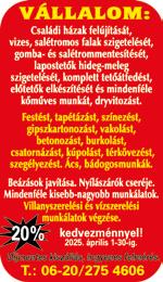 vállal házak építését felújítását, repedt, süllyedt házak vizesedését, beázását, dryvitozást, burkolást, festést, parkettázást, kerítés építését, javítását. Teljeskörű tetők elkészítését, kéményeket és kúpolásokat! Nyugdíjasoknak 20% kedvezmény március 1-április 30-ig. Tel: 06-30/885-9621