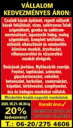 VÁLLAL KŐMŰVESMESTER: régi és új családi házak felújítását. Kőműves-Ács: vizes-salétromos, penészes falak megszüntetése, repedt-süllyedt falak helyreállítása, tetőszerkezet építése, javítása, beázása, kúpolása, kémények javítása, homlokzatszigetelés, fürdőhelyiségek átalakítása. Kerítések építése, javítása. Mindenféle külső-belső felújítást vállalok A-Zig. Sitt elszállítás. INGYENES FELMÉRÉS. 25% KEDVEZMÉNNYEL 2025.05.15.-06.30.-ig! Tel.: 06-70/170-5930.