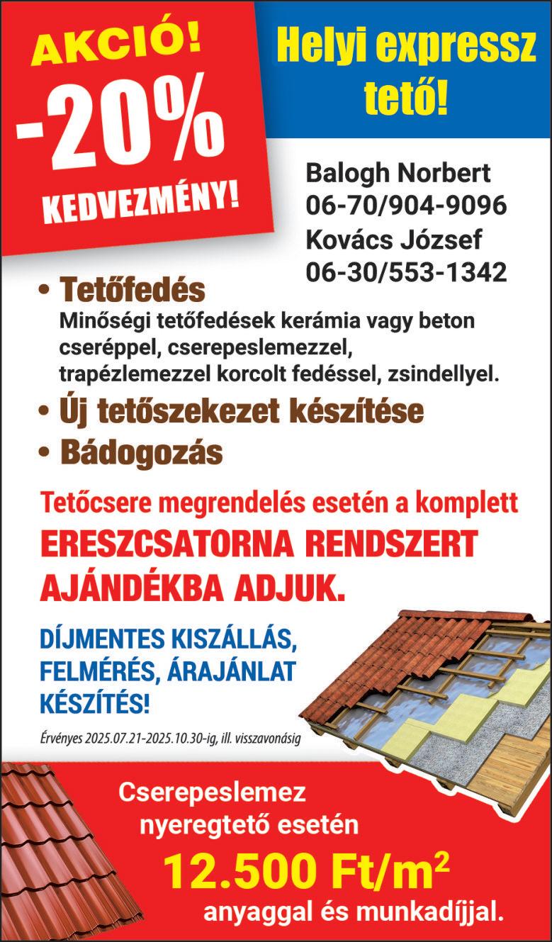 ÁCS-, tetőfedő, bádogosmunkák, régi palatető felújítása, nyaralók készítése, felújítása. Cserepeslemez-akció, 10% kedvezmény augusztus végéig. +3630/164-0793