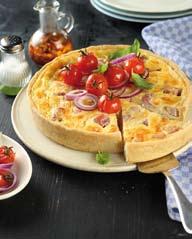 6. A megmosott koktélparadicsomokat tegyük tűzálló tálba, locsoljuk meg egy kevés olívaolajjal, és süssük 180 fokon 20 percig. Ezután vegyük ki, hagyjuk kihűlni a paradicsomokat, végül forgassuk össze őket egy kevés olívaolajjal, a meghámozott, felkarikázott lila hagymával és néhány bazsalikomlevéllel. Halmozzuk a keveréket a quiche-re, és felszeletelve tálaljuk. Elkészítési idő: 75 perc + pihentetés